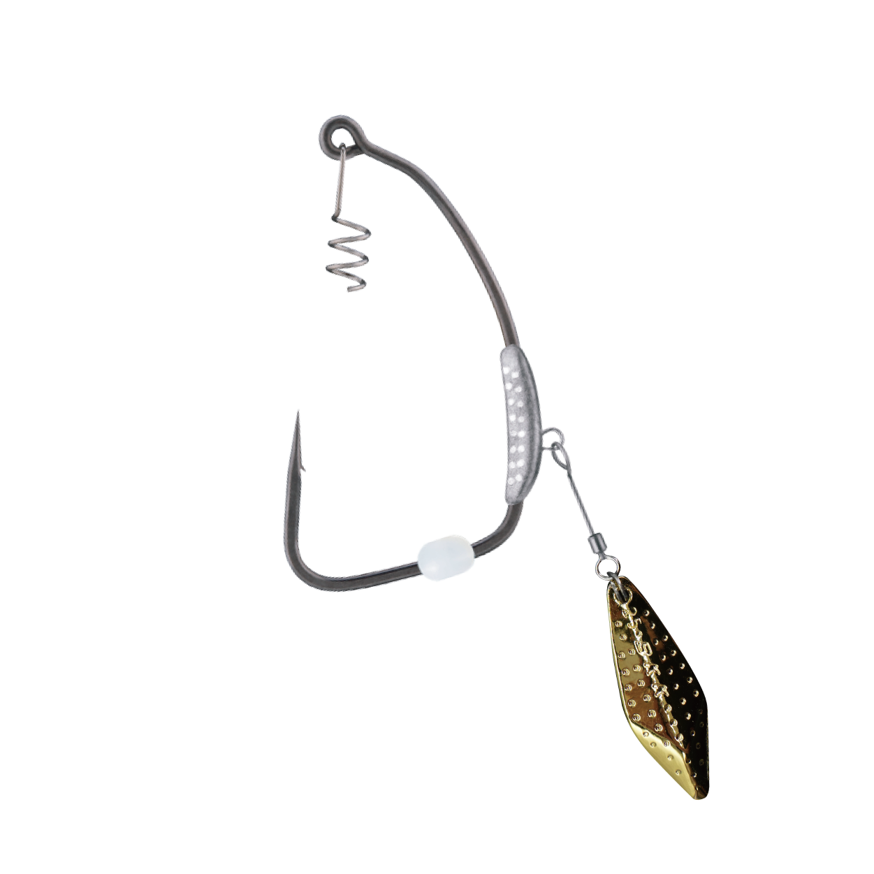 The weight itself is equipped with a stainless-steel ring, allowing for the optional attachment of a spinning blade. The blade adds a fish-attracting flash, enhancing the appeal of the presentation. The gold color blade has been added to the lineup for its excellent visibility in low light conditions and stained/muddy water. Silver is better suited for brighter conditions and clearer water.