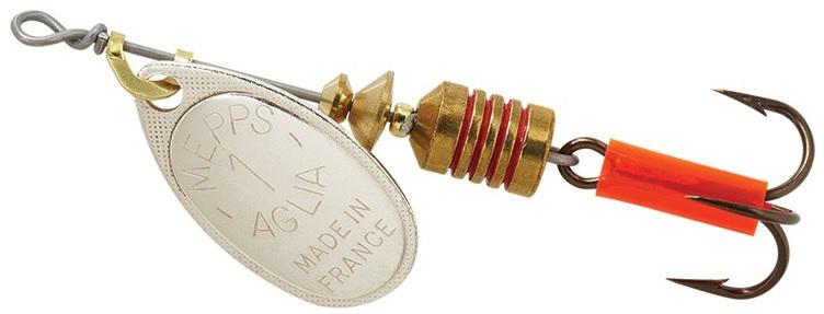The hooks on dressed Aglias in sizes #1-#5 are dressed with natural squirrel tail or bucktail. Dressed Aglias in size #1 (1/8) and #2 (1/6) are perfect for larger stream trout and large bluegills, sunfish and crappies. Size #2 Aglias are also excellent for smallmouth bass and walleye. Mepps Aglias in sizes #3 (1/4) and #4 (1/3) are preferred by largemouth bass fishermen. Size #4 (1/3) and #5 (1/2) Aglias are ideal for large rainbow trout and steelhead, as well as coho (silver) and chinook (king) salmon. Northern pike and giant tackle busting musky will inhale a dressed #5 Mepps spinner.